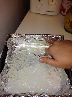 1. Line a 8 or 9-inch square pan with foil and let it hang over the sides. Butter the foil.